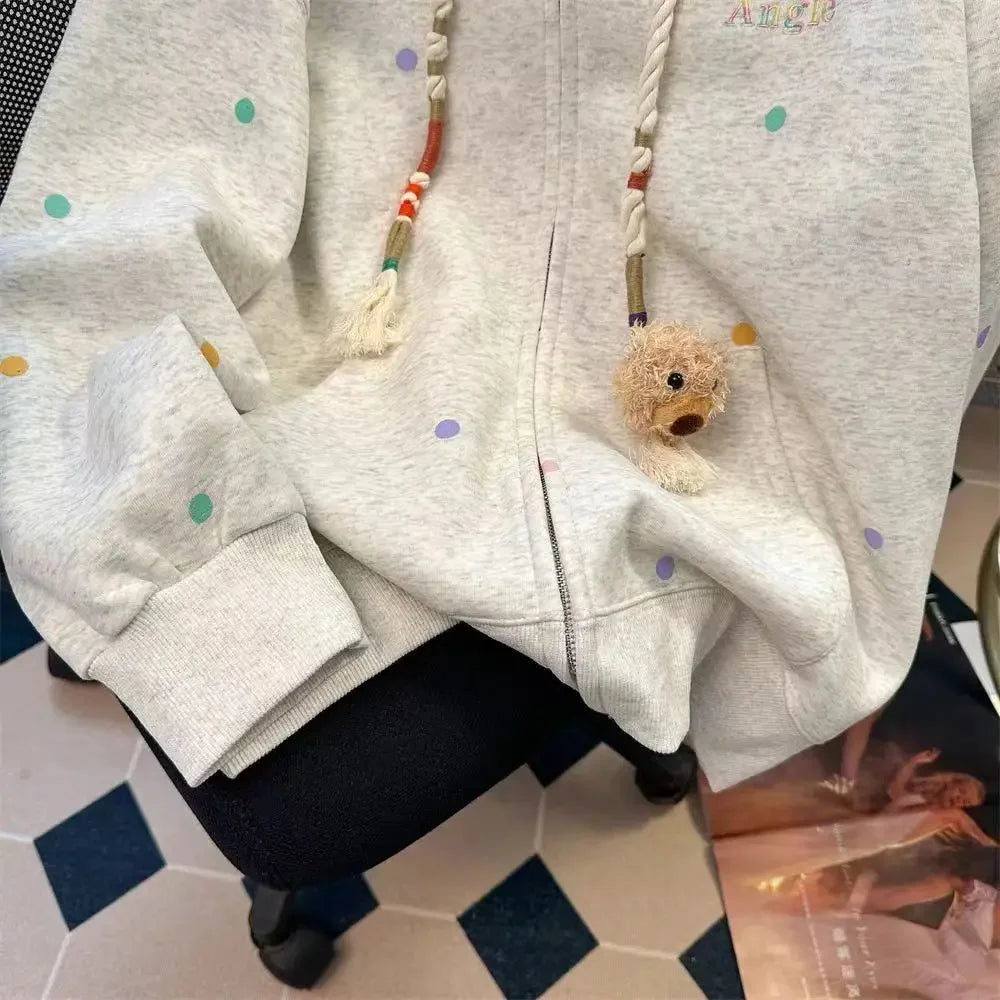 American retro color polka-dot embroidery hooded sweater women's autumn and winter loose design casual Joker cardigan coat